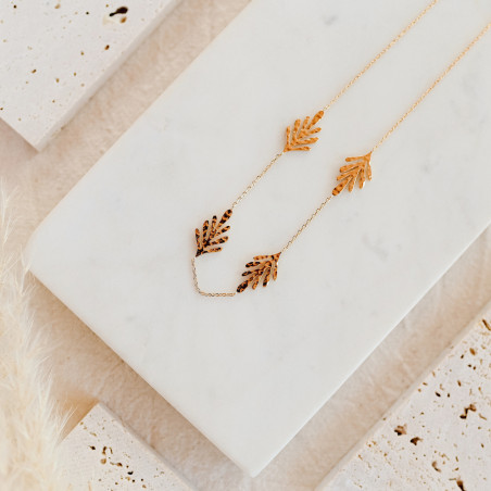〰️Collar con motivos en forma de hoja, acabados en mate y martelé . Mide 45 cm y tiene tres posibles largos, 40, 42,5 y 45 cm.