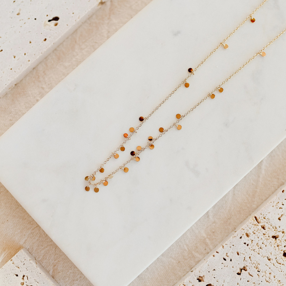 〰️Collar con pequeñas medallas a lo largo de la cadena. Mide 42 cm y tiene tres posibilidades de largo, 38,5, 40 y 42 cm. Acabado brillante.